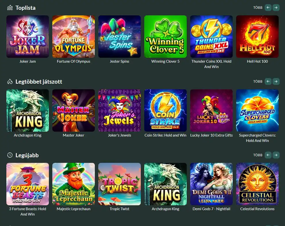 | Nyerőgép-könyvtár | 5 500+ játék, RTP 94-98%, többféle téma, funkciógazdag kiadások |